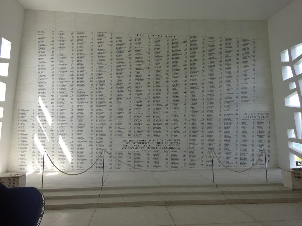 The memorial to the USS Arizona is thought provoking and moving when you know it rests on top of the ship that was sunk with over 900 men buried with it. When you look over the side of the memorial you can still see some parts of the ship not far from the surface of the water. Some of the survivors from that fateful day, Dec 7th 1941, who have subsequently died, have also had their ashes buried within the wreckage.