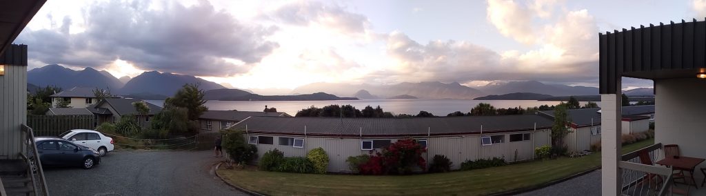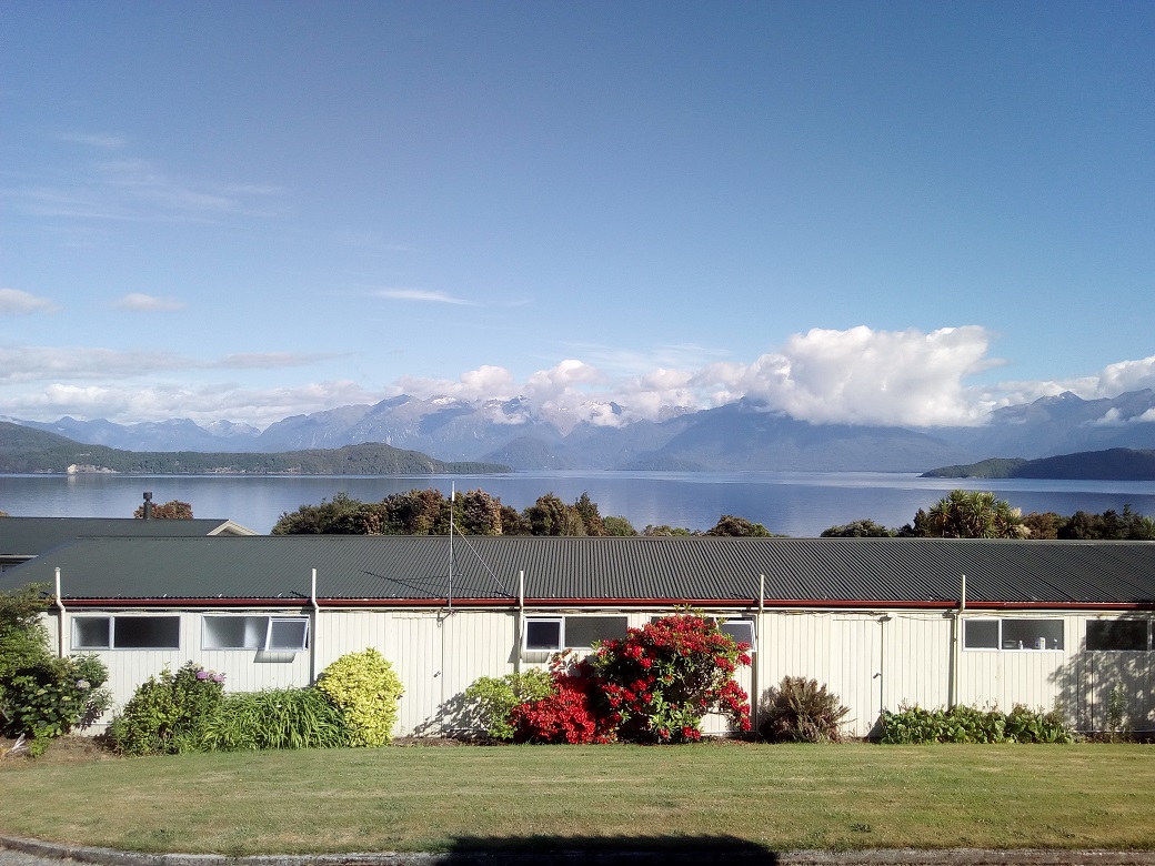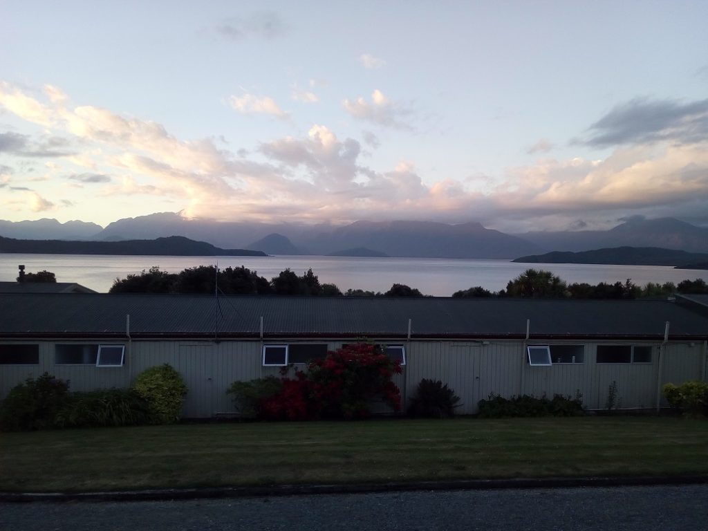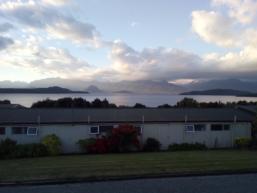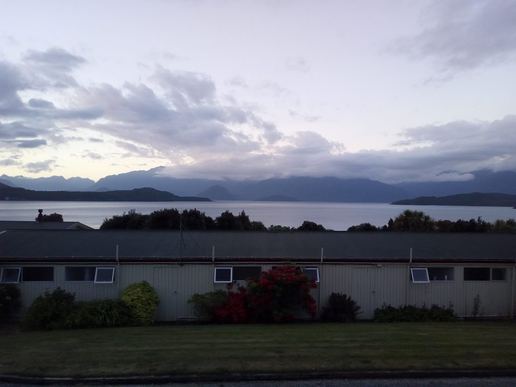 We are staying in a small motor lodge off Lake Manapouri. Not much there, the lodge, a bar and restaurant, and a view……