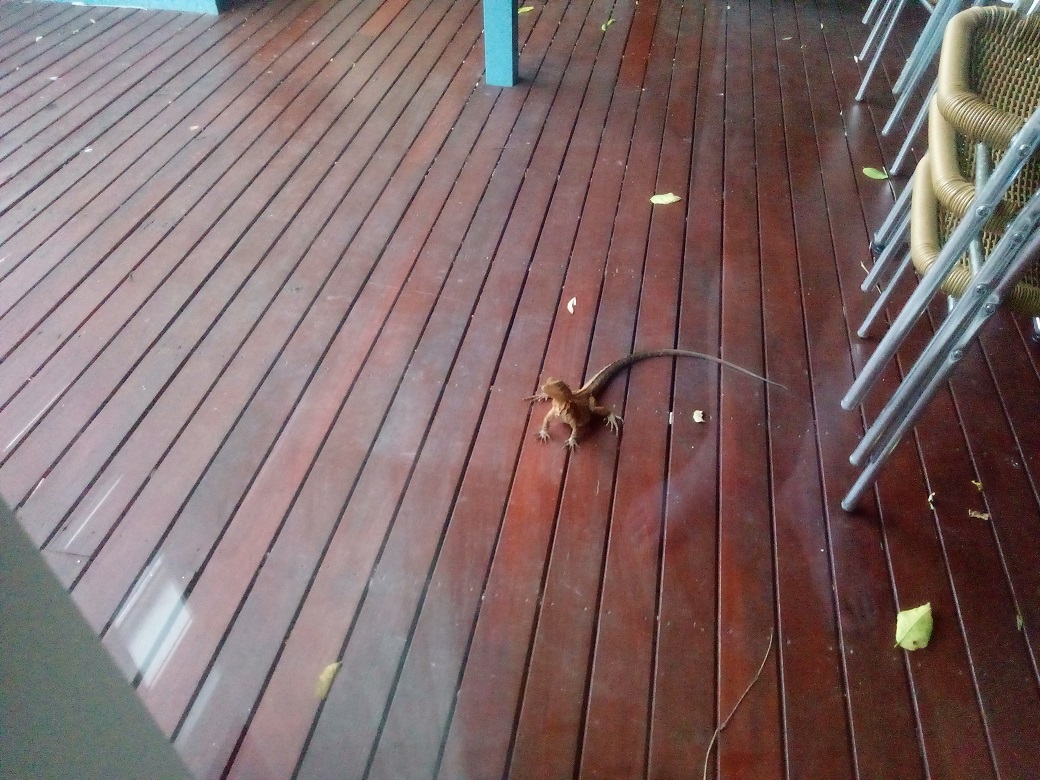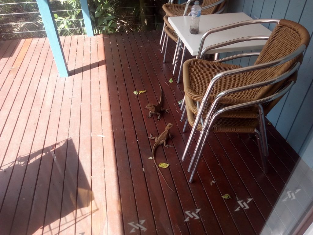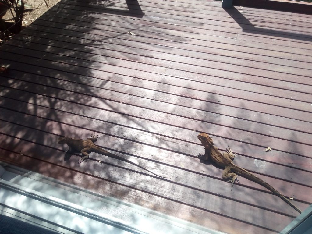 These guys are around 2ft long, they don’t really scare easily, they lurk and scuttle! I think they are Australian Water Dragons, they are territorial and our patio seems to be their territory. We have counted 4 regulars so far. If you shoo them away they are back in minutes.