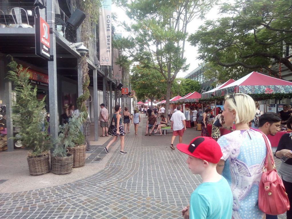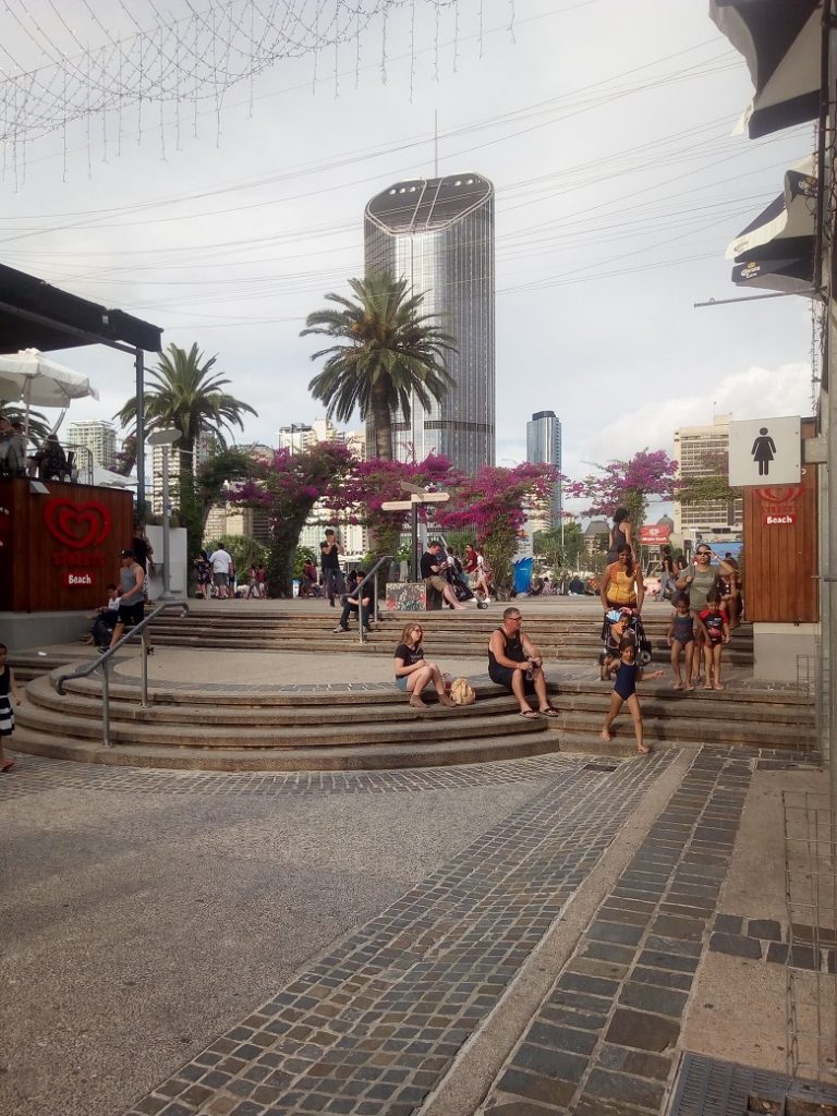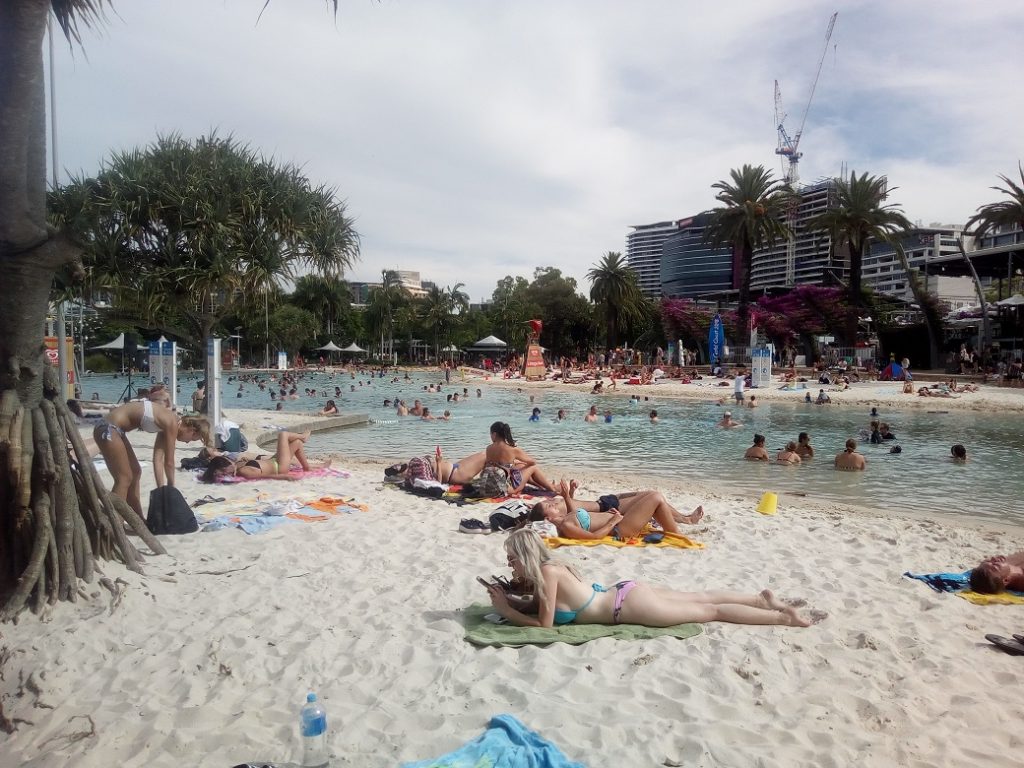 Brisbane is on the river rather than having a central beach, but the town Council built one. Streets beach is free for all and just off the river on the South Bank. it even has it’s own beach cinema.